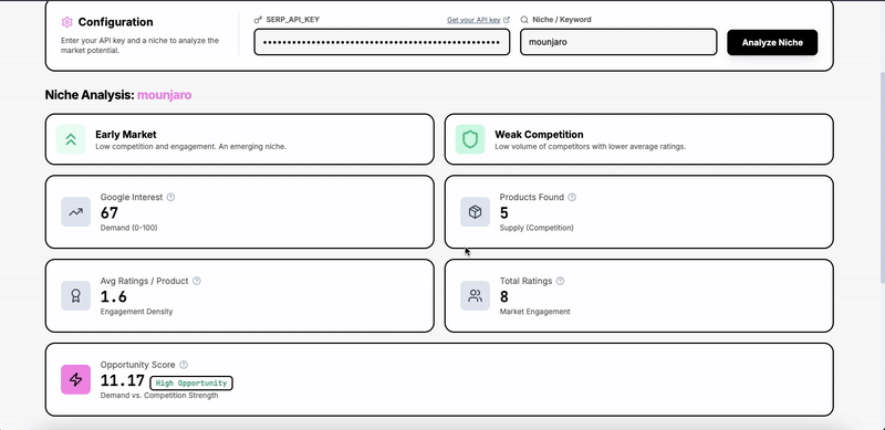Opportunity Score = Google Interest / ((Products × Engagement Factor) + 1)